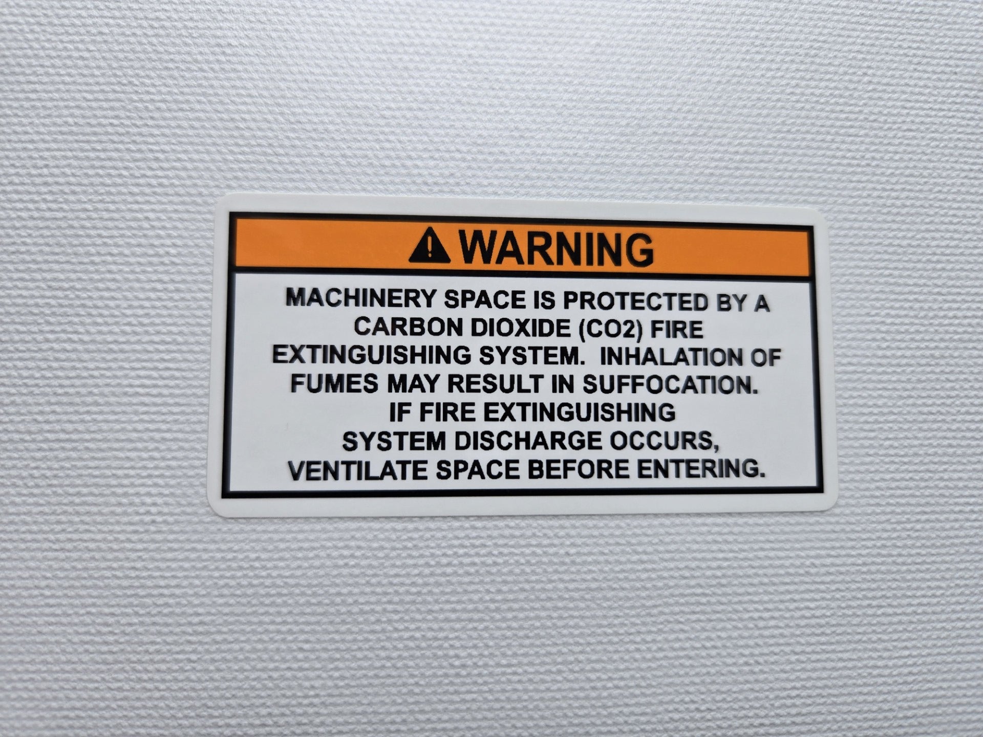 Please Note: This is a replacement label, but C02 extinguishing systems are not currently recommended by ABYC. ABYC Standards Section A-4 "Fire Fighting Equipment," updated July 2023, now contains the following wording: