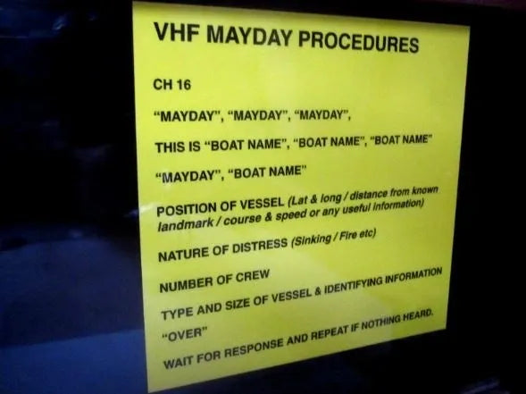 We hope you'll never need this label, but we think it's a smart thing to have near the radio in case the unthinkable happens. - 6" x 6" Label; black letters on a yellow background; 2 Mil cast vinyl with a clear overlaminate It reads: VHF MAYDAY PROCEDURES CH 16 "MAYDAY, MAYDAY, MAYDAY" THIS IS "BOAT NAME", "BOAT NAME", "BOAT NAME" "MAYDAY", "BOAT NAME" POSITION OF VESSEL (Lat & long/distance from known landmark/course & speed or any useful information) NATURE OF DISTRESS (Sinking/Fire etc.) NUMBER OF CREW TYPE AND SIZE OF VESSEL & IDENTIFYING INFORMATION "OVER" Wait for response and repeat if nothing heard. Â
