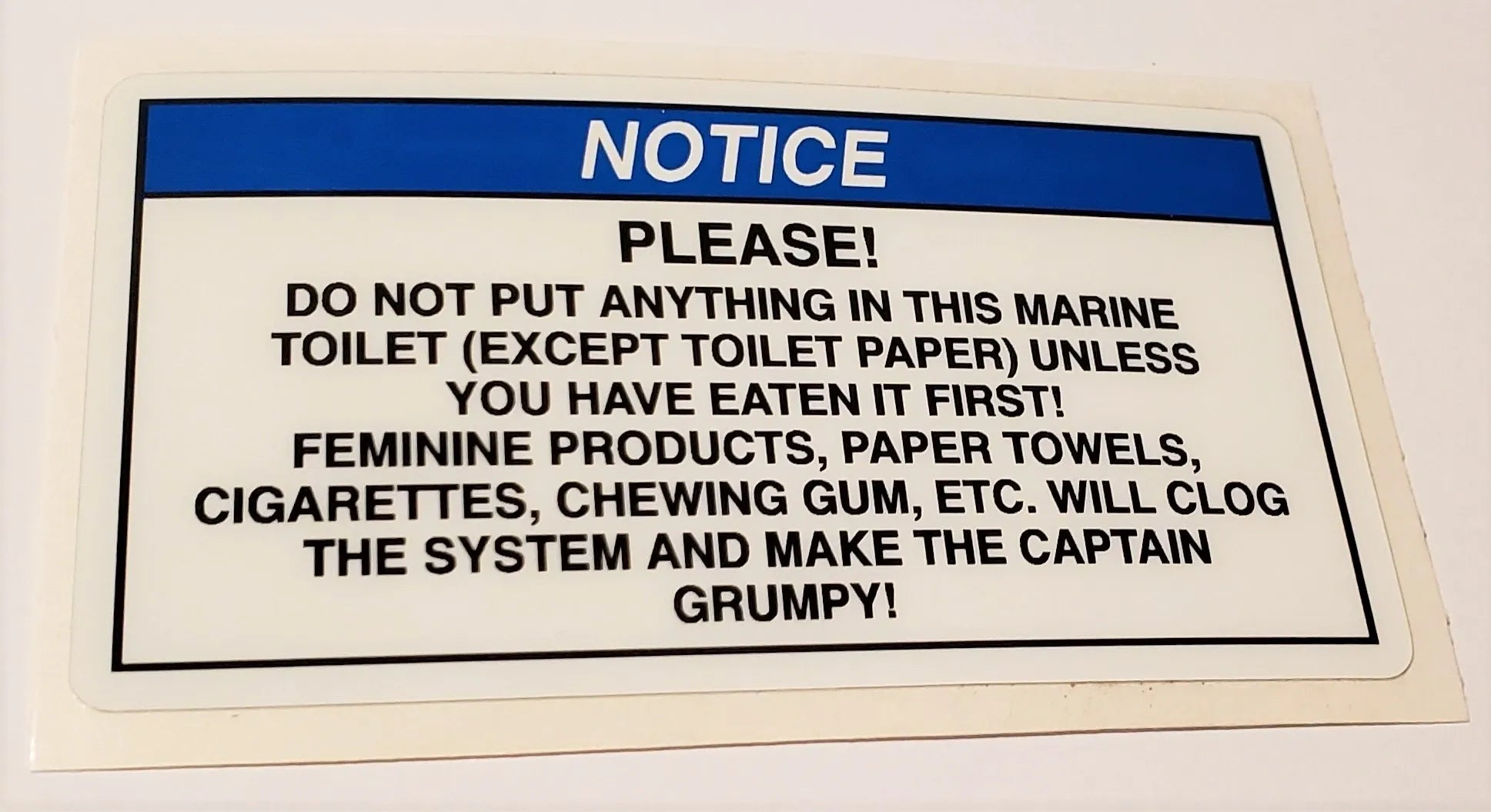 Finally a clear message to put in plain view of the marine toilet (head) in your boat. If this label saves even one nasty disassembly/unclogging session, it will have paid for itself several times over. Size: 4" x 2.25" Rectangular